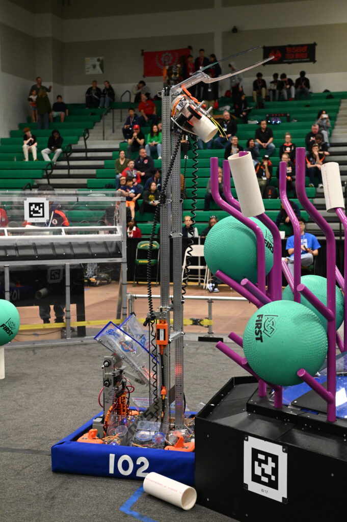 Shocker involved a nested telescoping elevator system to manipulate large PVC tetrahedron game pieces. Shocker quickly and effectively placed the game pieces atop the field pyramids to secure points.